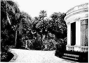 Mais c'est au merveilleux décor des végétaux que ces Jardins doivent leur splendeur. Le sol, rocheux et granitique, se prête d'ailleurs à la croissance des arbres, arbustes et Palmiers, et surtout des Mimosas, qui prennent des proportions colossales, et aux autres émigrés du Cap et de la Nouvelle Hollande, qui fleurissent tout l'Hiver et le Printemps. Le rôle des plantations, dans un Parc paysager, est de masquer les parties du jardin ou celle des abords qu'on ne veut pas voir, d'encadrer les vues et de faire valoir les points essentiels. Pour cela, on les dispose en massifs compacts, en groupes détachés, jetés en avant des massifs ou seuls en isolé sur les pelouses. Les végétaux, remarquables par leur port, par leur taille ou par leur aspect gracieux, sont habituellement choisis pour être ainsi mis en vedette. Lorsqu'elles encadrent une vue, les plantations sont un peu traitées à la façon des coulisses de théâtre, avec des parties en creux et en avancé, car la ligne droite doit être bannie de ces groupements. Ces règles ont été observées dans tous leurs détails en faisant rendre le maximum d'effet aux admirables végétaux qui meublent le Jardin. La grande coulée sur le côté est de la Villa, qui dirige la vue sur le cap d'Antibes, est admirablement encadrée ; à droite, par un bouquet de Dattiers aux stipes élevés ; à gauche, par des groupes de gigantesques Cocotiers, dont les troncs nus portent à 20 mètres de hauteur les panaches de leurs frondes arquées, qui se détachent sur le ciel bleu comme dans un paysage africain.