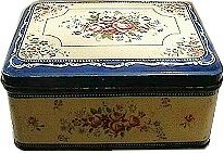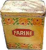 Il existe 6 boîtes de couleur bleue : chicorée, pâtes, café, chocolat en poudre, farine, sucre. |