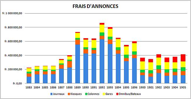 Etat comparatif des frais d'annonces entre 1883 et 1905 sur le tout le territoire. A partir de 1900 les annonces dans les wagons seront associés aux gares.