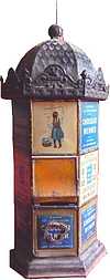 Sur une face, une tôle lithographiée estampée d'après Firmin Bouisset. Les prises sont décorées par des têtes de lion. A l'intérieur un pot en grès de 56 cm pour un diamètre de 34 cm. Ce percolateur était utilisé pendant l'exposition universelle de 1900. |