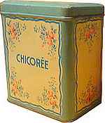 Il existe 6 boîtes de couleur bleue : chicorée, pâtes, café, chocolat en poudre, farine, sucre. |