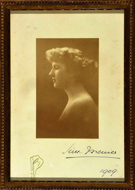 Mlle Simonne Legrand mariée à Georges Menier en 1903. Tirage argentique de 1909 d'Arnold Casimir Roessinger-Jeanneret photographe à Montreux Suisse. Signature du modèle et du photographe, tampon sec du studio.