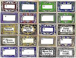 ÉTIQUETTES A BOCAUX DE PHARMACIE Deux planches exécutées avec le plus grand soin, présentent les modèles les plus variés de deux fabriques dont la réputation est bien établie (SAINTON- FROYER). Elles reproduisent sur une petite échelle, avec une parfaite exactitude, le dessin de la vignette, la contexture et le papier de chaque étiquette. |