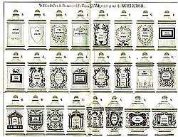 VERRERIE ET POTERIE Nous avons mis un soin extrême à faire reproduire la forme et les ornements des pots de porcelaine. Cette planche permettra au pharmacien éloigné de Paris, de faire un choix des objets qui conviennent à son goût, avec autant de netteté que s'il était dans les magasins les mieux assortis. |